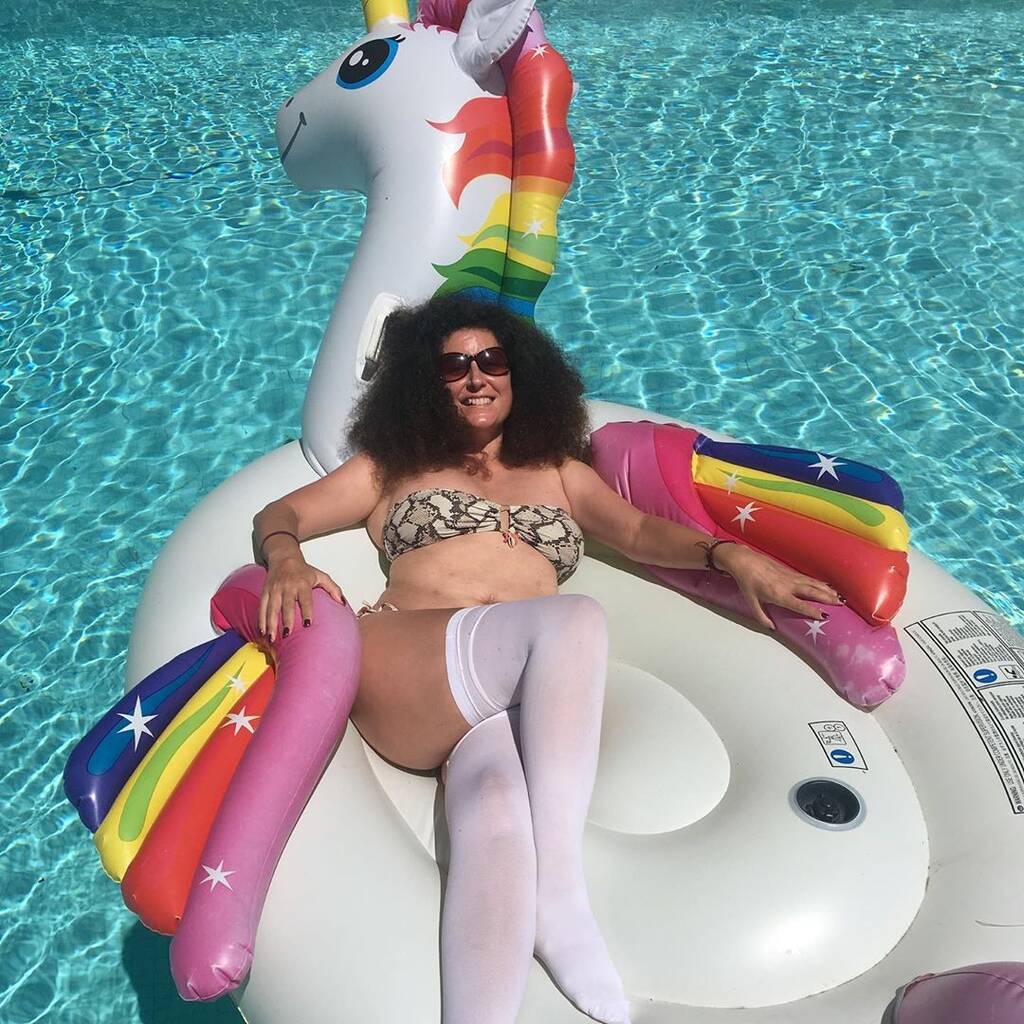 Αυτή τη φορά λοιπόν, πόζαρε πάνω σε ένα φουσκωτό μονόκερο μέσα σε μια πισίνα φορώντας αντιθρομβωτικές κάλτσες.