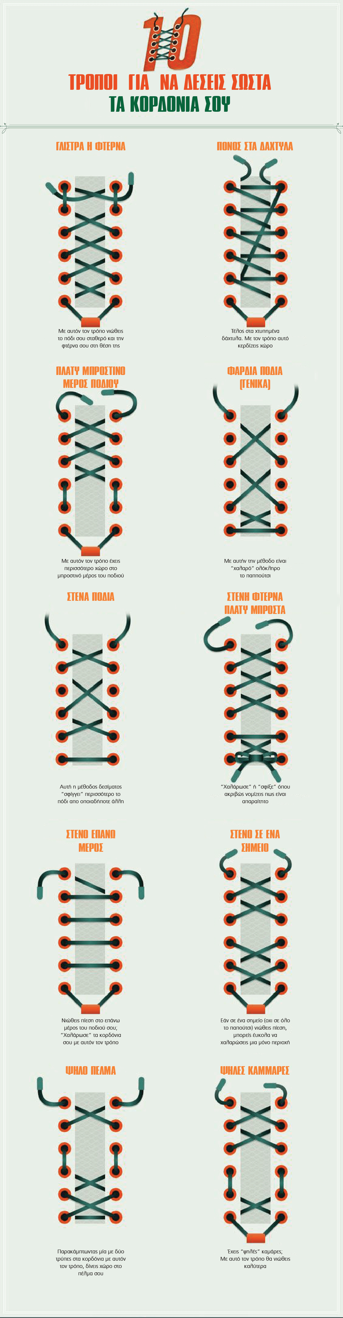 Επειδή, όμως, τα πολλά λόγια είναι φτώχεια και στην προκειμένη περίπτωση δεν πρόκειται να σε βοηθήσουν, δες παρακάτω στο σχεδιάγραμμα τρόπους για να δέσεις τα κορδόνια των παπουτσιών σου.