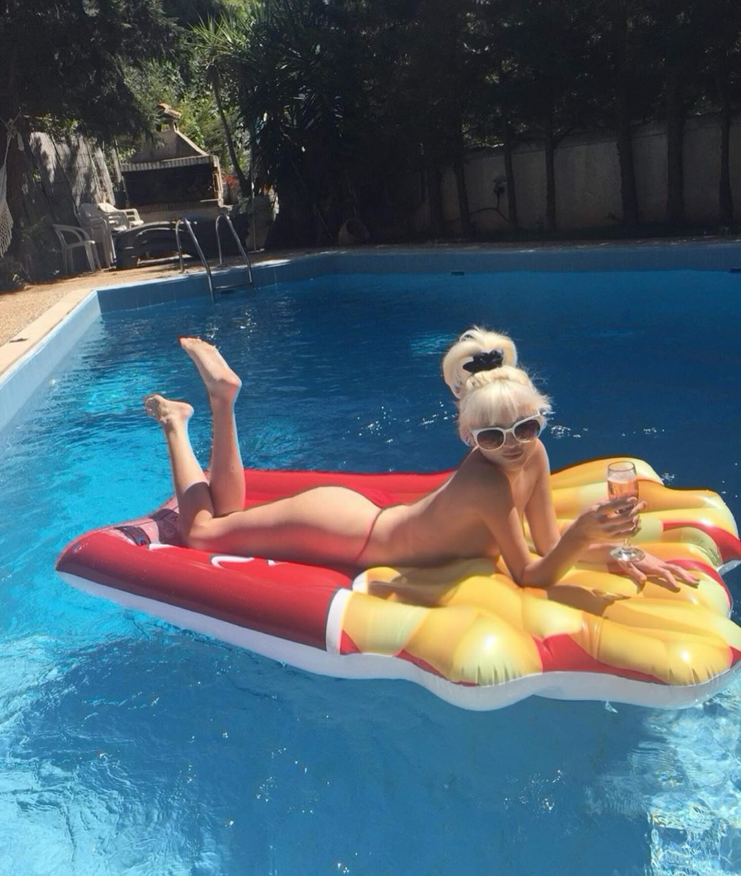 Η Τζούλια Αλεξανδράτου ανάρτησε μια φωτογραφία στον λογαριασμό της στο Instagram που την δείχνει να ποζάρει τόπλες στην πισίνα της επάνω σε ένα φουσκωτό με σχήμα που θυμίζει την συσκευασία με τις πατάτες των φαστ φουντ.