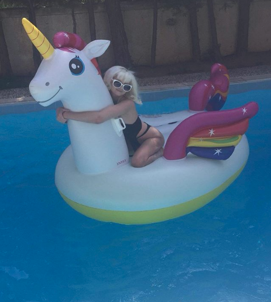 Πριν από λίγες ημέρες, η Τζούλια Αλεξανδράτου είχε ανεβάσει κι άλλες φωτογραφίες στον λογαριασμό της από τις βουτιές της στην πισίνα, αλλά αυτή την φορά με ένα φουσκωτό μονόκερο, τον οποίο αποκάλεσε «νέο της καλύτερο φίλο»