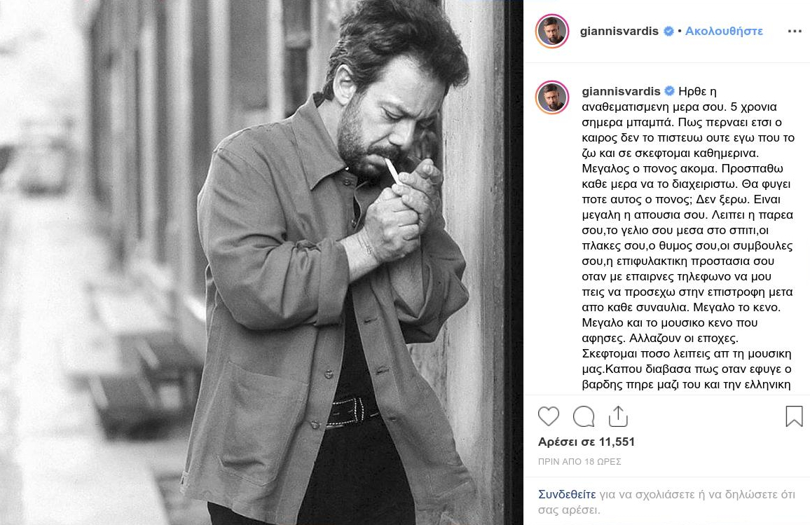 Πέντε χρόνια συμπληρώνονται σήμερα από τον χαμό του και ο γιος του Γιάννης, δημοσίευσε στον προσωπικό του λογαριασμό στο Instagram μια φωτογραφία του πατέρα του, την οποία συνόδευσε με ένα συγκινητικό μήνυμα.