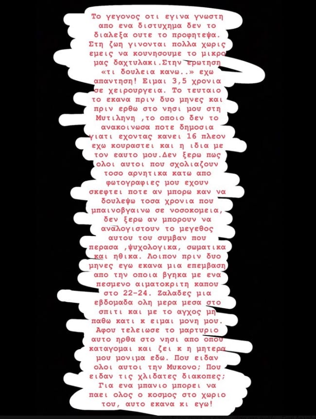 Δεν ξέρω πως όλοι αυτοί που σχολιάζουν τόσο αρνητικά κάτω από φωτογραφίες μου έχουν σκεφτεί ποτέ αν μπορώ καν να δουλέψω τόσα χρόνια που μπαινοβγαίνω σε νοσοκομεία, δεν ξέρω αν μπορούν να αναλογιστούν το μέγεθος αυτού του συμβάντος που πέρασα, ψυχολογικά, σωματικά και ηθικά. Λοιπόν, πριν δυο μήνες εγώ έκανα μια επέμβαση από την οποία βγήκα με ένα πεσμένο αιματοκρίτη κάπου στο 22-24. Ζαλάδες μια εβδομάδα όλη μέρα μέσα στο σπίτι και με το άγχος μην πάθω κάτι και είμαι μόνη μου.