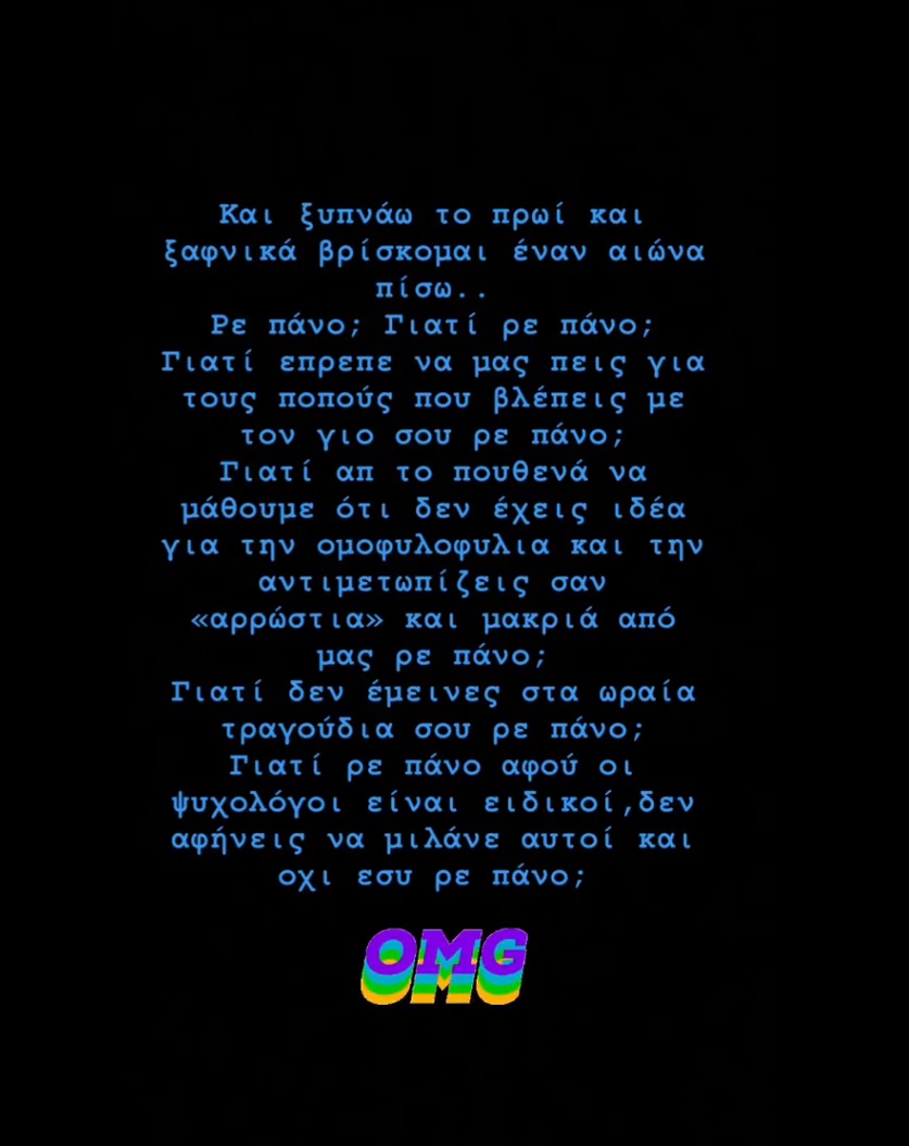 «Και ξυπνάω το πρωί και ξαφνικά βρίσκομαι έναν αιώνα πίσω… Ρε Πάνο; Γιατί ρε Πάνο; Γιατί έπρεπε να μας πεις για τους ποπούς που βλέπεις με τον γιο σου ρε Πάνο; Γιατί από το πουθενά να μάθουμε ότι δεν έχεις ιδέα για την ομοφυλοφιλία και την αντιμετωπίζεις σαν “αρρώστια” και μακριά από μας ρε Πάνο; Γιατί δεν έμεινες στα ωραία τραγούδια σου ρε Πάνο; Γιατί ρε Πάνο αφού οι ψυχολόγοι είναι ειδικοί, δεν αφήνεις να μιλάνε αυτοί και όχι εσύ ρε Πάνο;», έγραψε χαρακτηριστικά.
