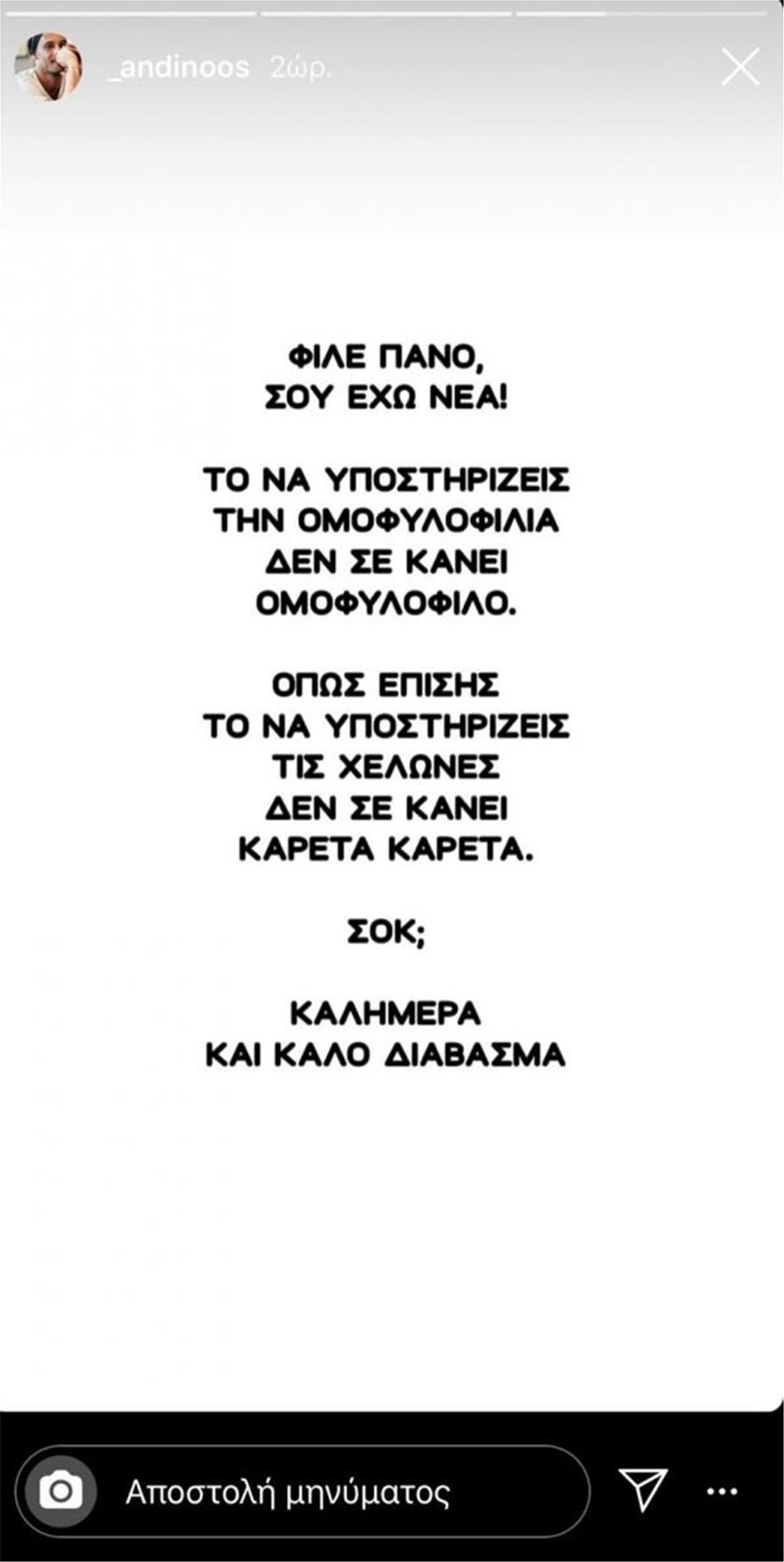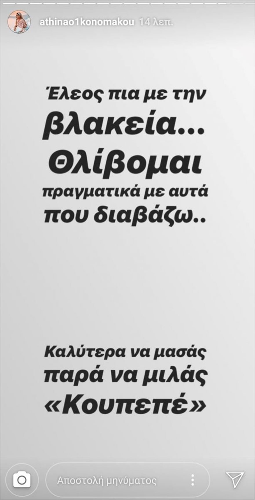 Συγκεκριμένα, έγραψε: «Δυστυχώς ζούμε στη χώρα που το φυσιολογικό μοιάζει αφύσικο και κάποιοι το παίζουν πολύ μπροστά και άνετοι μα όταν συμβεί στο σπίτι τους λένε “γιατί σε εμένα;”. Πολύ σπάνια τοποθετούμε, μάλλον σχεδόν ποτέ, αλλά σας βαρέθηκα κάποιους ψευτο celebrities, μη πω καμιά κουβέντα άλλη, αλλά το επίπεδο μου δεν φτάνει τον πάτο που έχετε στην ψυχή σας. Οπότε ο Θεός θα σας κρίνει».