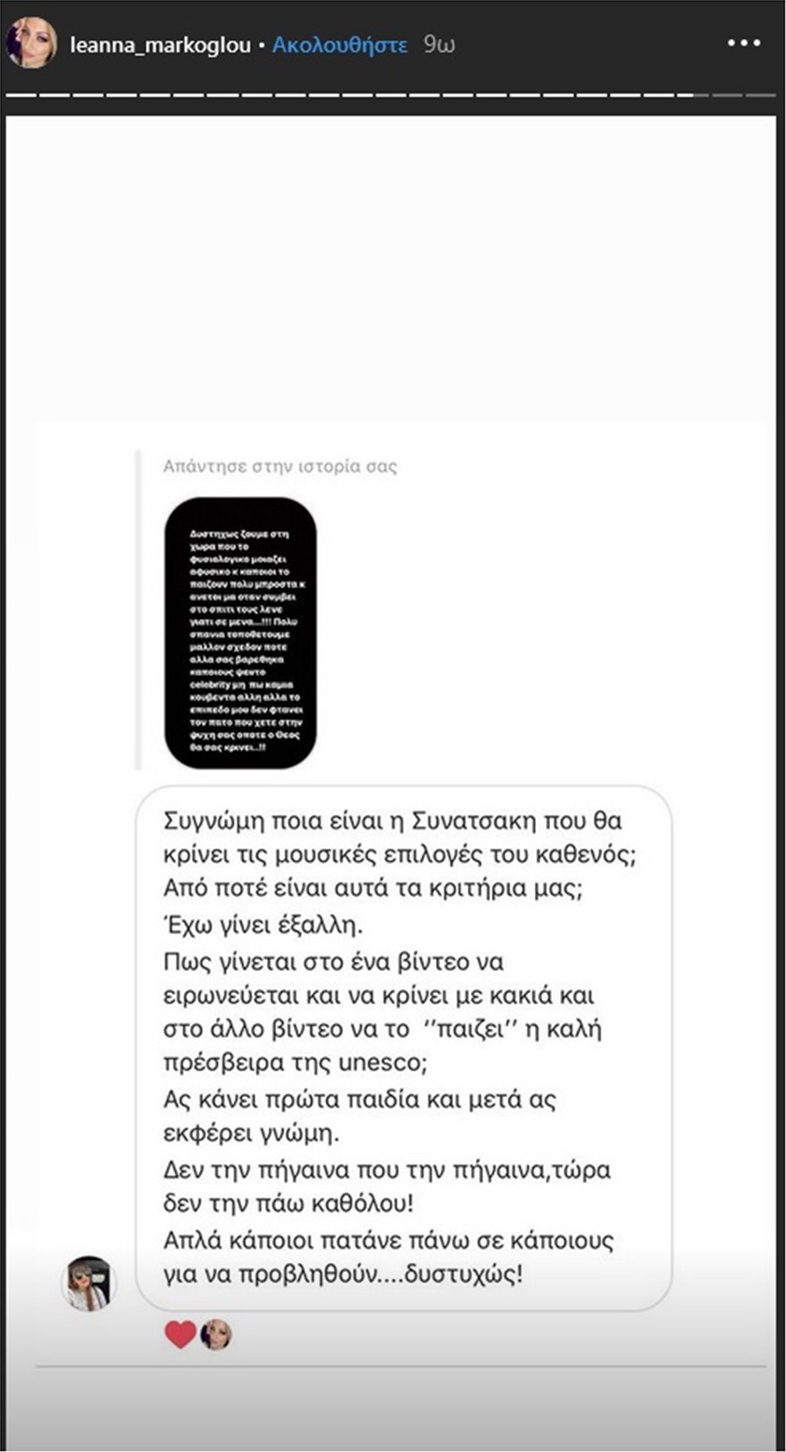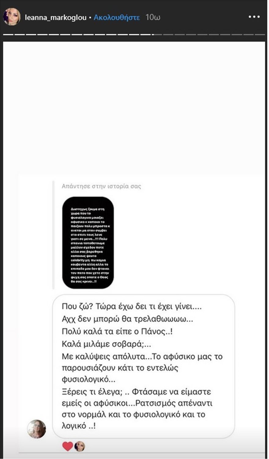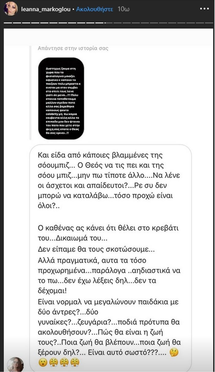 Στη συνέχεια η σύζυγος του τραγουδιστή ανέβασε στα stories αποσπάσματα από διάλογους που είχε με αρκετούς follower της για το θέμα…