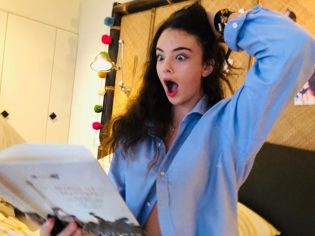 Η εικόνα δείχνει την έφηβη Ντέβα να διαβάζει ένα βιβλίο με μια έκφραση έκπληξης. Η νεαρή φοράει ένα μπλε πουκάμισο, στο οποίο έχει κουμπώσει μόνο ένα κουμπί και…τραβάει τα μαλλιά της