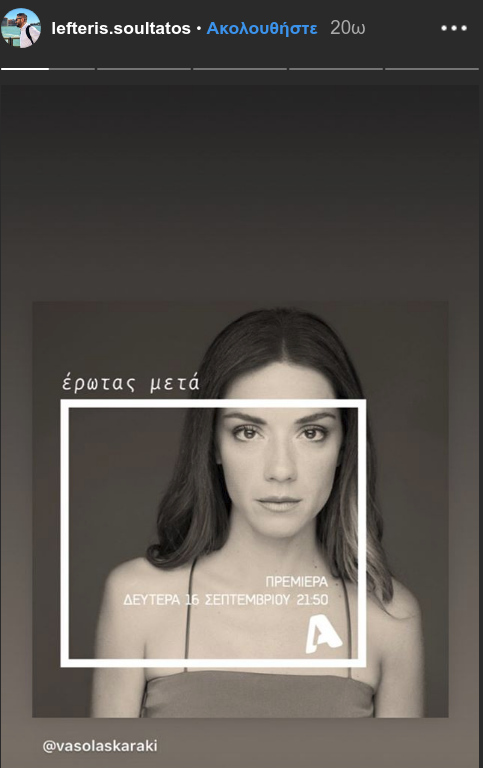 Ο σεφ Λευτέρης Σουλτάτος δεν μπορούσε να μην κάνει τη δική του ανάρτηση με αφορμή τη μεγάλη πρεμιέρα της σειράς στην οποία πρωταγωνιστεί η σύζυγός του Βάσω Λασκαράκη. Με μια ασπρόμαυρη φωτογραφία της ηθοποιού και το λογότυπο της σειράς «Έρωτας Μετά…» ο Λευτέρης Σουλτάτος υπενθύμισε σε όσους τον ακολουθούν την μεγάλη πρεμιέρα.