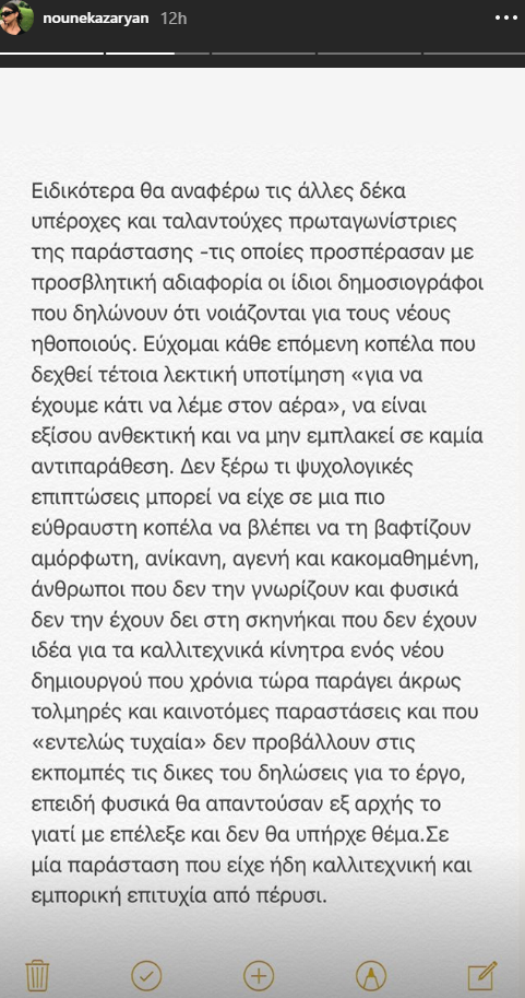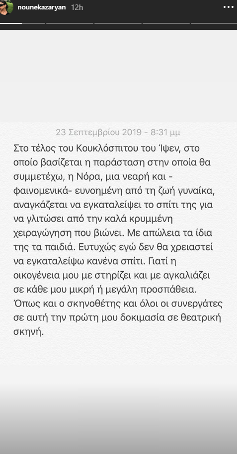 Παρομοιάζοντας τον εαυτό της με τη Νόρα, το ρόλο που ενσαρκώνει, η Ειρήνη Καζαριάν απάντησε στους επικριτές της.