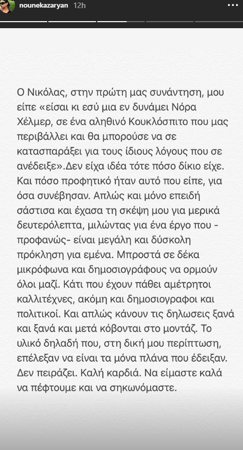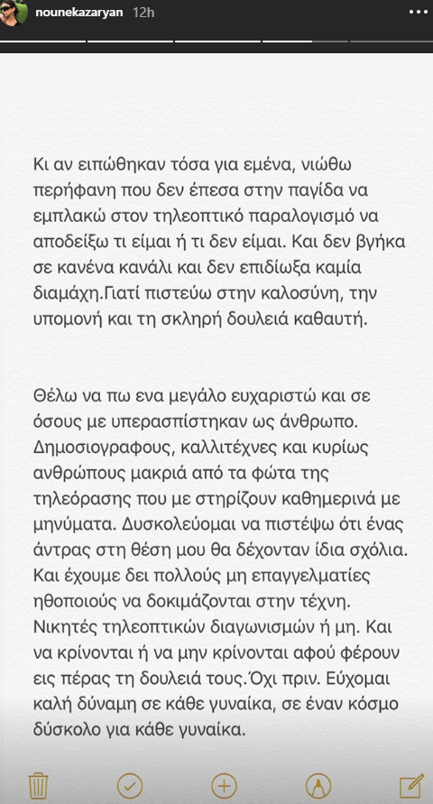 Στην κριτική που δέχθηκε η Ειρήνη Καζαριάν, μετά το πρώτο σχόλιο τύπου… δεν με νοιάζει, αποφάσισε να απαντήσει τώρα, μέσω Insta Stories. Ο λόγος της σοβαρός και μετρημένος, εξέπληξε πολλούς.
