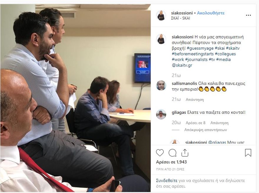 H παρουσιάστρια του κεντρικού δελτίου ειδήσεων του ΣΚΑΪ κοινοποίησε μέσω instagram μία φωτογραφία με τους συνεργάτες της, να παρακολουθούν προσηλωμένοι το τηλεπαιχνίδι «Guess my age» που παρουσιάζει κάθε απόγευμα ο Γιώργος Λιάγκας.