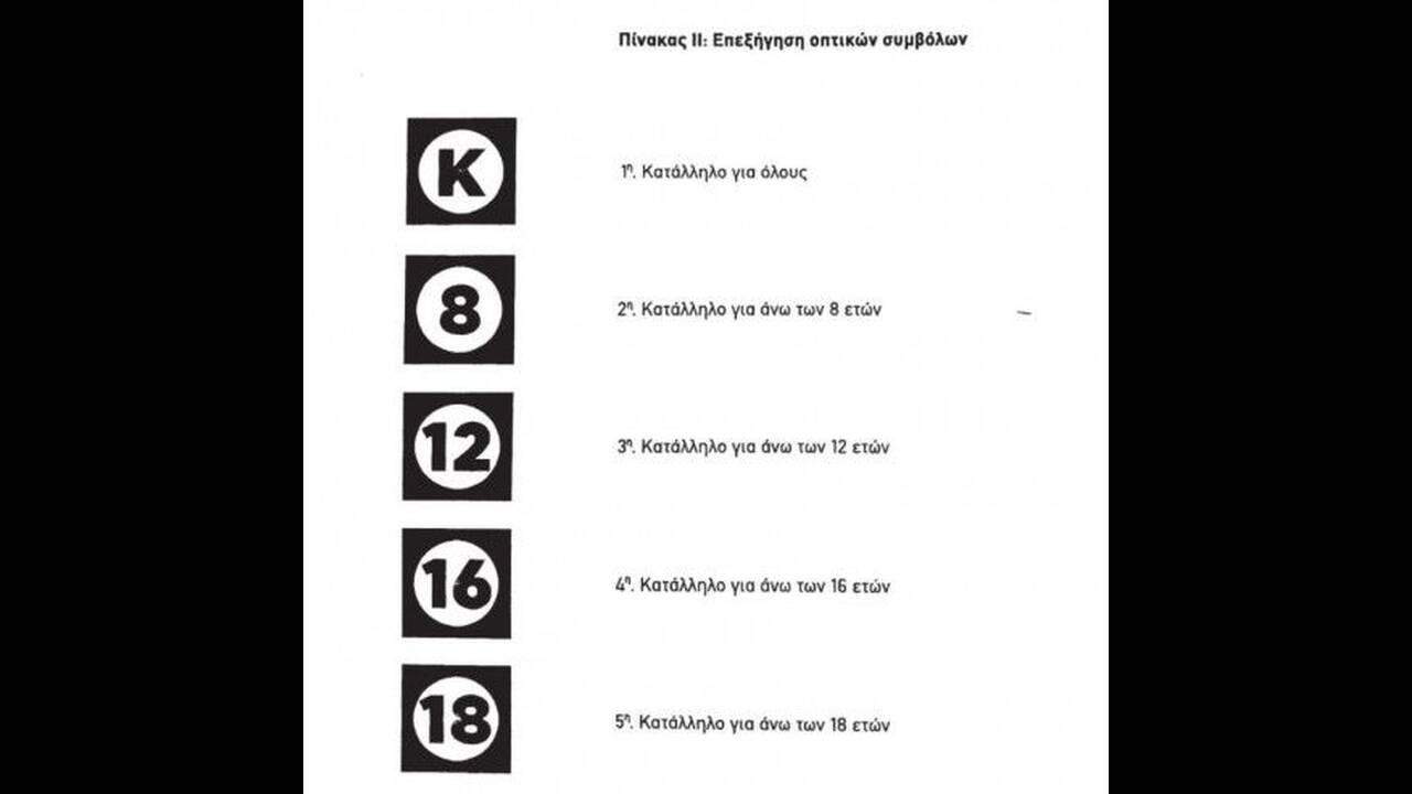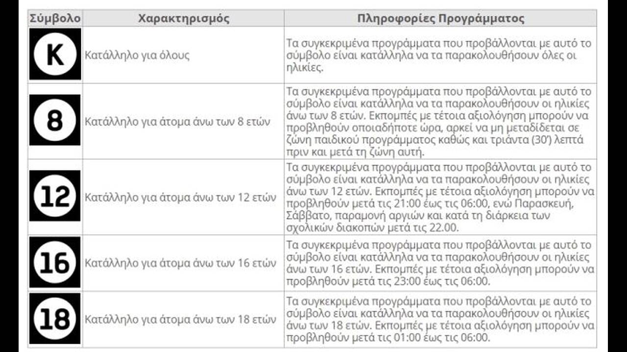 Μετά από σχετική απόφαση του ΕΣΡ εισάγονται πέντε ηλικιακές κατηγορίες: «Κατάλληλο για όλους», «Κατάλληλο άνω των 8 ετών», «Κατάλληλο άνω των 12 ετών», «Κατάλληλο άνω των 16 ετών» και «Κατάλληλο άνω των 18 ετών». Επίσης, θα υπάρχει ειδική σήμανση για σκηνές τηλεοπτικών προγραμμάτων που περιλαμβάνουν βία, σ@ξ, χρήση ουσιών και ακατάλληλη φρασεολογία.