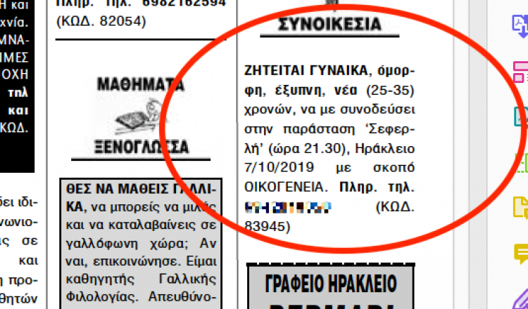 Θα μπορούσε να είναι μέρος σκετς του ίδιου του Μάρκου Σεφερλή, όμως είναι μια αγγελία πέρα για πέρα αληθινή, που δημοσιεύτηκε στην εφημερίδα «ΠΑΤΡΙΣ».