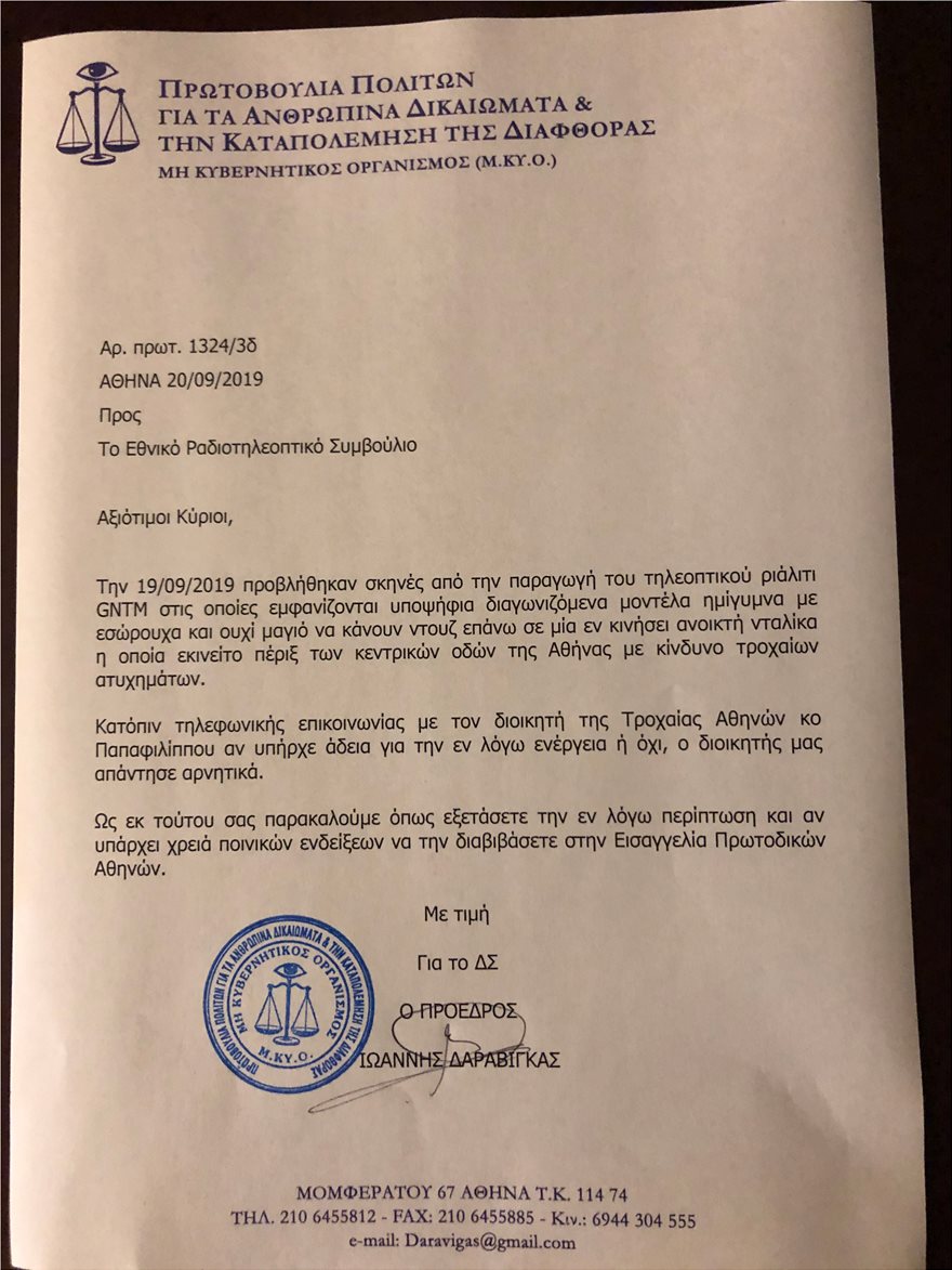 Συγκεκριμένα, σύμφωνα με το περιεχόμενο της έγγραφης καταγγελίας που κατέθεσε στο Εθνικό Ραδιοτηλεοπτικό Συμβούλιο, η μη κυβερνητική οργάνωση, Πρωτοβουλία Πολιτών Για τα Ανθρώπινα Δικαιώματα και την Καταπολέμηση της Διαφθοράς: «Την 19/09/2019 προβλήθηκαν σκηνές από την παραγωγή του τηλεοπτικού ριάλιτι GNTM στις οποίες εμφανίζονται υποψήφια διαγωνιζόμενα μοντέλα ημίγυμνα με εσώρουχα και όχι μαγιό να κάνουν ντουζ επάνω σε μια εν κινήσει ανοικτή νταλίκα η οποία εκινείτο πέριξ των κεντρικών οδών της Αθήνας με κίνδυνο τροχαίων ατυχημάτων. Κατόπιν τηλεφωνικής επικοινωνίας με τον διοικητή της Τροχαίας Αθηνών κ. Παπαφιλίππου αν υπήρχε άδεια για την εν λόγω ενέργεια ή όχι, ο διοικητής μας απάντησε αρνητικά. Ως εκ τούτου σας παρακαλούμε όπως εξετάσετε την εν λόγω περίπτωση και αν υπάρχει χροιά ποινικών ενδείξεων να την διαβιβάσετε στην Εισαγγελία Πρωτοδικών Αθηνών».