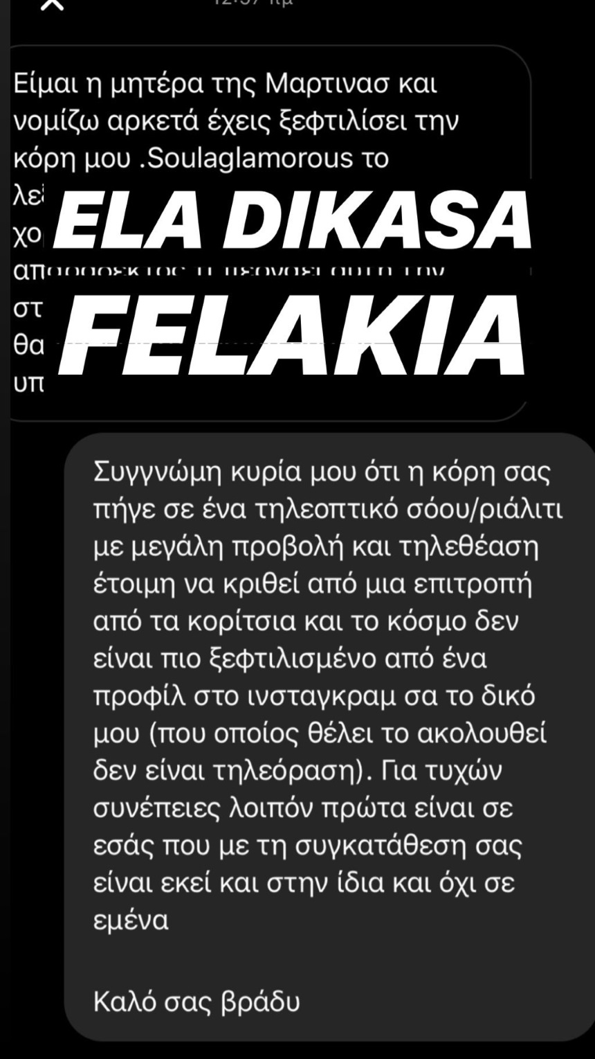 «Είμαι η μητέρα της Μαρτίνας και νομίζω αρκετά έχεις ξεφτιλίσει την κόρη μου. Soula Glamorous το λεξιλόγιο που έχεις για τη Μαρτίνα χορεις να τη ξέρεις είναι απαράδεκτος τι περνάει αυτή τη στιγμή η κόρη μου ξέρω μόνο εγώ. Αν θα πάθει κάτι η κόρη μου θα υπάρχουν συνέπειες» ήταν το μήνυμα που έστειλε, με την Soula να σχολιάζει τα ορθογραφικά.