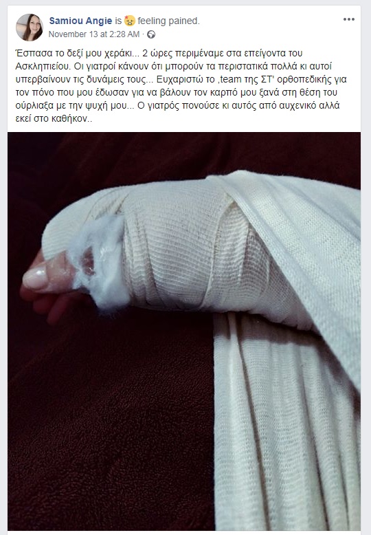 «Έσπασα το δεξί μου χεράκι… 2 ώρες περιμέναμε στα επείγοντα του Ασκληπιείου. Οι γιατροί κάνουν ότι μπορούν τα περιστατικά πολλά κι αυτοί υπερβαίνουν τις δυνάμεις τους… Ευχαριστώ το, team της ΣΤ’ ορθοπεδικής για τον πόνο που μου έδωσαν για να βάλουν τον καρπό μου ξανά στη θέση του ούρλιαξα με την ψυχή μου… Ο γιατρός πονούσε κι αυτός από αυχενικό αλλά εκεί στο καθήκον…» , έγραψε χαρακτηριστικά στη λεζάντα που την συνόδευε.