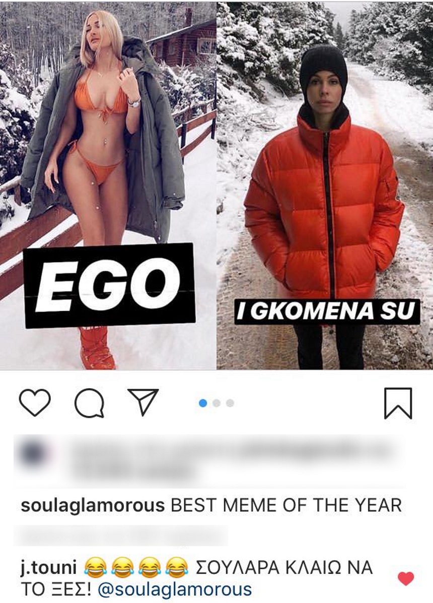 Το βράδυ της Τετάρτης, η γνωστή περσόνα του Instagram, η Soula Glamorous σχολίασε με χιουμοριστικό τρόπο το νέο ειδύλλιο της showbiz, παίρνοντας, όπως θα δεις, ξεκάθαρα το μέρος της Ιωάννας Τούνη. Η ξανθιά Θεσσαλονικιά φυσικά και δεν θα μπορούσε να μην σχολιάσει το συγκεκριμένο ποστ, αφού την αφορούσε άμεσα.
