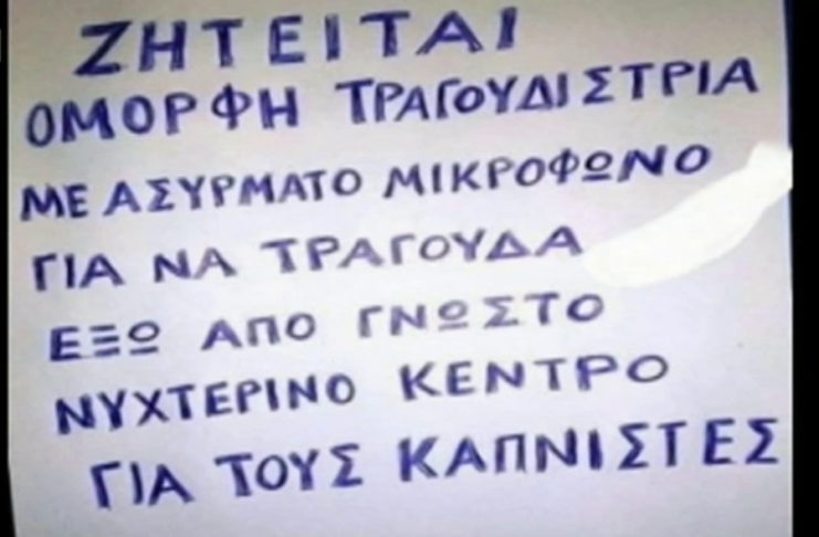 Έτσι, τις τελευταίες μέρες έχει γίνει viral μία φωτογραφία με μία αγγελία από ένα νυχτερινό κέντρο που αναζητά τραγουδίστρια που θα διασκεδάζει όχι αυτούς που βρίσκονται εντός του καταστήματος, αλλά αυτούς που είναι εκτός για τσιγάρο.