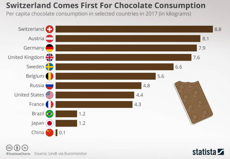 Η Ελβετία βρίσκεται στην πρώτη θέση της λίστας που δημοσίευσε Statista.com σχετικά με τη μέση ποσότητα κατανάλωσης σοκολάτας κατά άτομο. Εξάλλου, αν σκεφτεί κανείς ότι είναι στην κορυφή και στην παραγωγή σοκολάτας, αυτό έχει μια εξήγηση.