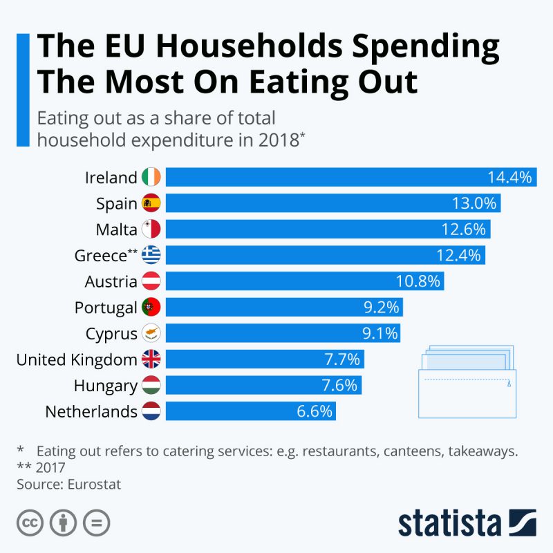 Σύμφωνα με πρόσφατα στοιχεία της Eurostat, τα νοικοκυριά στην Ευρωπαϊκή Ένωση δαπανούν περισσότερα από 600 δισεκατομμύρια ευρώ ετησίως σε υπηρεσίες εστίασης, όπως εστιατόρια και καφετέριες. Η Ιρλανδία είναι η χώρα με τις υψηλότερες δαπάνες σε φαγητό για το 2018 με 14,4%, ακολουθούμενη από την Ισπανία με 13% και τη Μάλτα 12,6%.