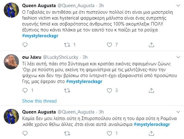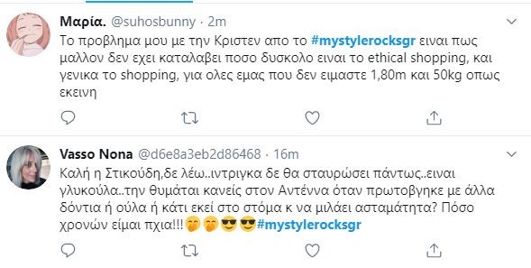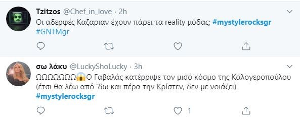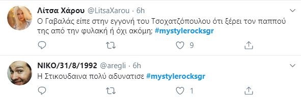 Το Hashtag #mystylerocksgr στο Twitter πήρε «φωτιά» μετά την χθεσινή πρεμιέρα και ένα από τα tweets που ξεχωρίσαμε ήταν: «Ο Γαβαλάς είπε στην εγγονή του Τσοχατζόπουλου ότι ξέρει τον παππού της από την φυλακή ή όχι ακόμη;»