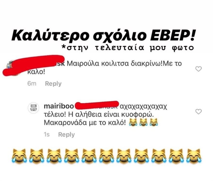 Ανάμεσα στα σχόλια που δέχτηκε η Μαίρη Συνατσάκη ήταν και ένα από follower της, ο οποίος θεώρησε πως η παρουσιάστρια είναι έγκυος. Συγκεκριμένα, της έγραψε: «Μαιρούλα κοιλίτσα διακρίνω! Με το καλό». Η παρουσιάστρια διάβασε το σχόλιο και μάλιστα απάντησε με χιούμορ: «Τέλειο! Η αλήθεια είναι ότι κυοφορώ μακαρονάδα με το καλό».