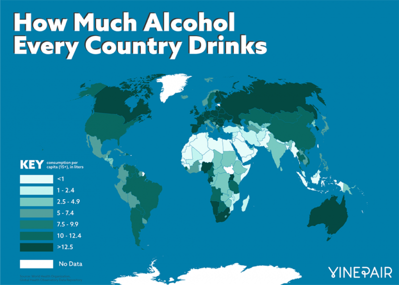 Ένας χάρτης που δημοσιεύτηκε πρόσφατα στο Reddit δείχνει την ποσότητα αλκοόλ που καταναλώνεται σε κάθε χώρα στον κόσμο.