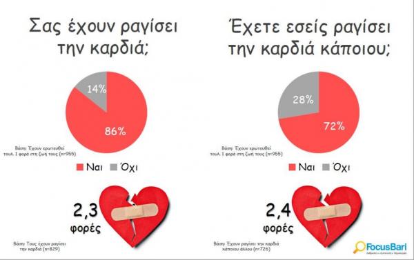 Οι άνδρες ισχυρίστηκαν ότι έχουν ερwτευτεί αλλά και αγαπήσει πραγματικά περισσότερο από ότι οι γυναίκες, ενώ στην ερώτηση αν σας έχουν ραγίσει την καρδιά οι ερωτηθέντες απάντησαν 2,3 φορές κατά μέσο όρο. Ακριβώς το ίδιο ποσοστό ισχύει στην ερώτηση αν έχετε εσείς ραγίσει την καρδιά κάποιου.