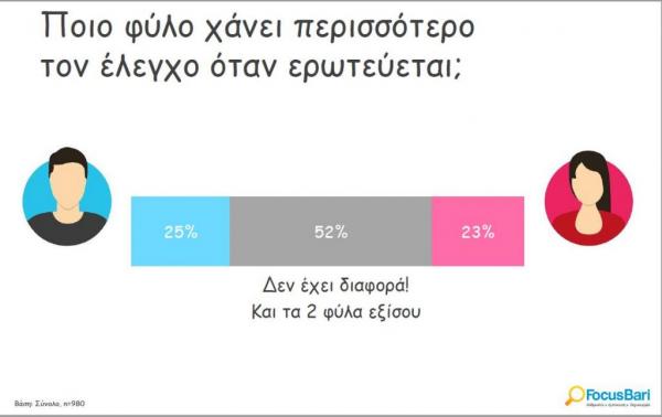 Ιδιαίτερο ενδιαφέρον παρουσιάζει η απάντηση στην ερώτηση «Ποιο φύλο χάνει περισσότερο τον έλεγχο όταν ερwτεύεται» στην οποία άνδρες και γυναίκες απάντησαν σε μεγάλο ποσοστό το ίδιο και τα δύο φύλα εξίσου.