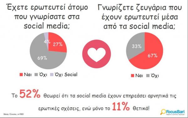Στον έρωτα μέσω social media εμφανίζεται και η μεγαλύτερη έκπληξη της έρευνας. Το 52% των ερωτηθέντων θεωρεί ότι έχουν επηρεάσει αρνητικά τις ερωτικές σχέσεις και μόνο το 11% θετικά.