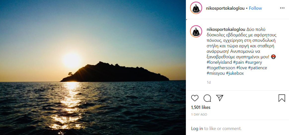 Ο αγαπημένος τραγουδοποιός, πριν από λίγες ώρες, έγραψε στον προσωπικό του λογαριασμό στο Instagram μήνυμα προς ενημέρωση όσων τον ακολουθούν: «Δύο πολύ δύσκολες εβδομάδες με αφόρητους πόνους, εγχείρηση στη σπονδυλική στήλη και τώρα αργή και σταθερή ανάρρωση! Ανυπομονώ να ξαναβρεθούμε αγαπημένοι μου».