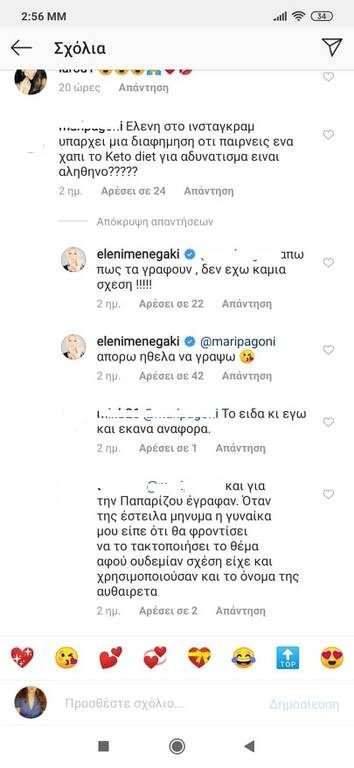 «Απορώ πως τα γράφουν! Δεν έχω καμία σχέση…», έγραψε στο διαδίκτυο μόλις πληροφορήθηκε από διαδικτυακή της φίλη και τηλεθεάτρια πως χρησιμοποιούν το όνομά της εν αγνοία της. «Ελένη στο ίνσταγκραμ υπάρχει μία διαφήμιση ότι παίρνεις ένα χάπι το Keto diet για αδυνάτισμα είναι αληθινό;» την ενημέρωσε.