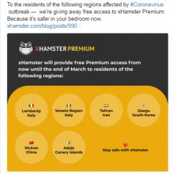 «Το xHamster ενθαρρύνει τους ανθρώπους των περιοχών που έχουν πληγεί να μείνουν μέσα… Ο πιο εύκολος τρόπος για να μην εξαπλωθεί ο ιός, είναι να αποφύγουμε την άμεση επαφή με άλλους ανθρώπους, και σε αυτό το πορνό μπορεί να βοηθήσει», ανέφερε ο Hawkins.