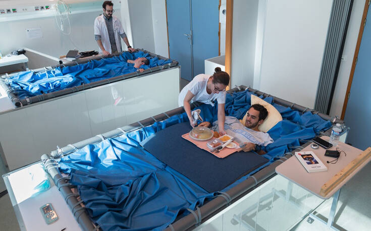 20 γυναίκες ανεξαρτήτου ηλικίας θα ξαπλώσουν σε ένα κρεβάτι μισό κανονικό, μισό πισίνα για 5 ημέρες, στο Institute for Space Medicine and Physiology στην Τουλούζη της Γαλλίας.