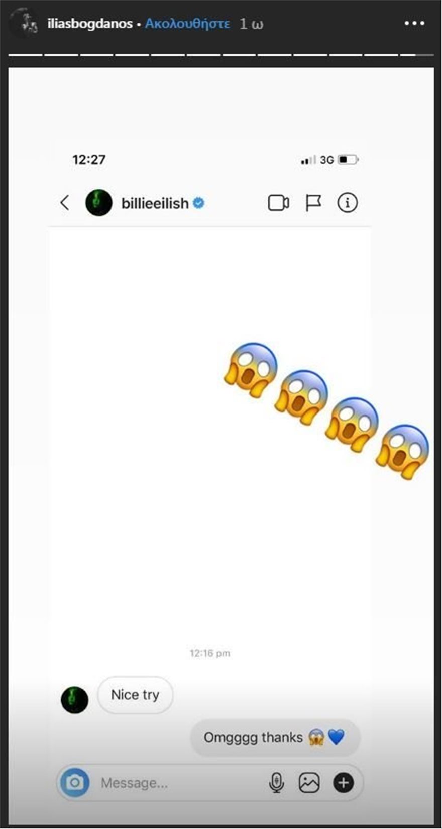 Ενθουσιασμένος με την απάντησή της, ο Ηλίας Μπογδάνος δημοσίευσε στα Ιnstastories του προσωπικού του λογαριασμού στο Ιnstagram το μήνυμα της, χωρίς καν να μπορεί να το πιστέψει.