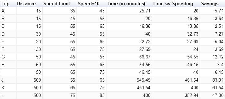 Υπολόγισε προορισμούς διαφορετικών αποστάσεων (15, 30, 50 και 500 μίλια) με διαφορετικές ταχύτητες, πάντα 10 μίλια/ώρα πάνω από το όριο ταχύτητας.
