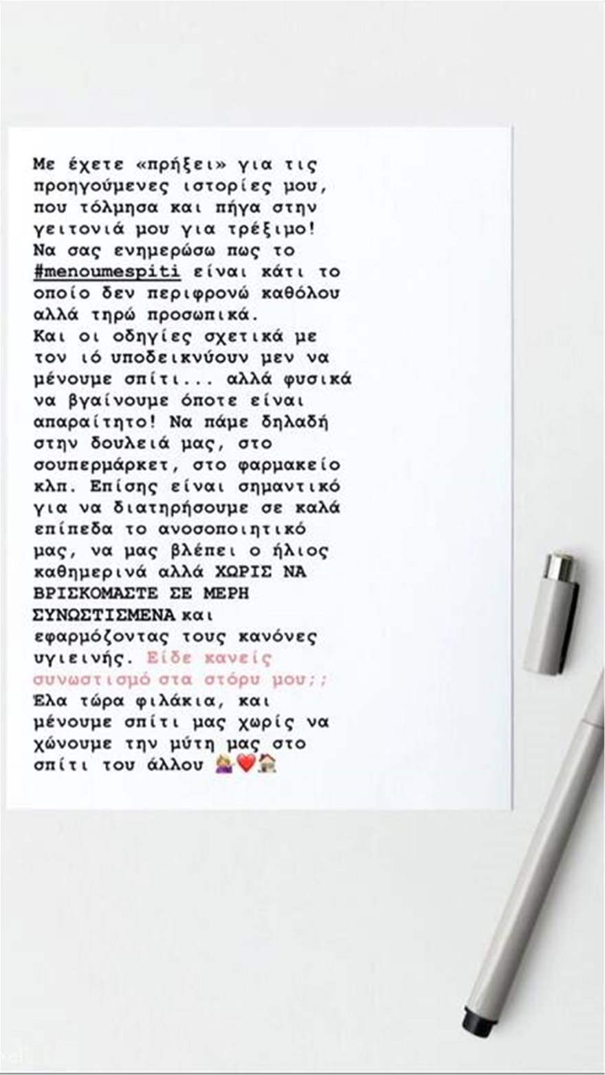 «Με έχετε πρήξει για τις προηγούμενες ιστορίες μου, που τόλμησα και πήγα στην γειτονιά μου για τρέξιμο. Να σας ενημερώσω πως το #menoumespiti είναι κάτι το οποίο δεν το περιφρονώ καθόλου αλλά τηρώ προσωπικά. Και οι οδηγίες σχετικά με τον ιό υποδεικνύουν μεν να μένουμε σπίτι… αλλά φυσικά να βγαίνουμε όποτε είναι απαραίτητο! Να πάμε δηλαδή στη δουλειά μας, στο σούπερ μάρκετ, στο φαρμακείο κλπ. Επίσης είναι σημαντικό για να διατηρήσουμε σε καλά επίπεδα το ανοσοποιητικό μας, να μας βλέπει ο ήλιος καθημερινά αλλά ΧΩΡΙΣ ΝΑ ΒΡΙΣΚΟΜΑΣΤΕ ΣΕ ΜΕΡΗ ΣΥΝΩΣΤΙΣΜΕΝΑ και εφαρμόζοντας τους κανόνες υγιεινής. Είδε κανείς συνωστισμό στα Story μου; Έλα τώρα φιλάκια και μένουμε σπίτι χωρίς να χώνουμε τη μύτη μας στο σπίτι του άλλου» έγραψε η Ιωάννα Τούνη.