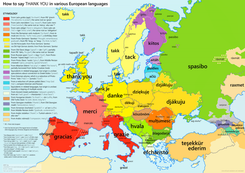 Ο χάρτης που ακολουθεί μας δείχνει πώς λέμε ευχαριστώ σε διάφορες γλώσσες, όπως στα αγγλικά, στα σουηδικά, στα πορτογαλικά και στα τούρκικα.