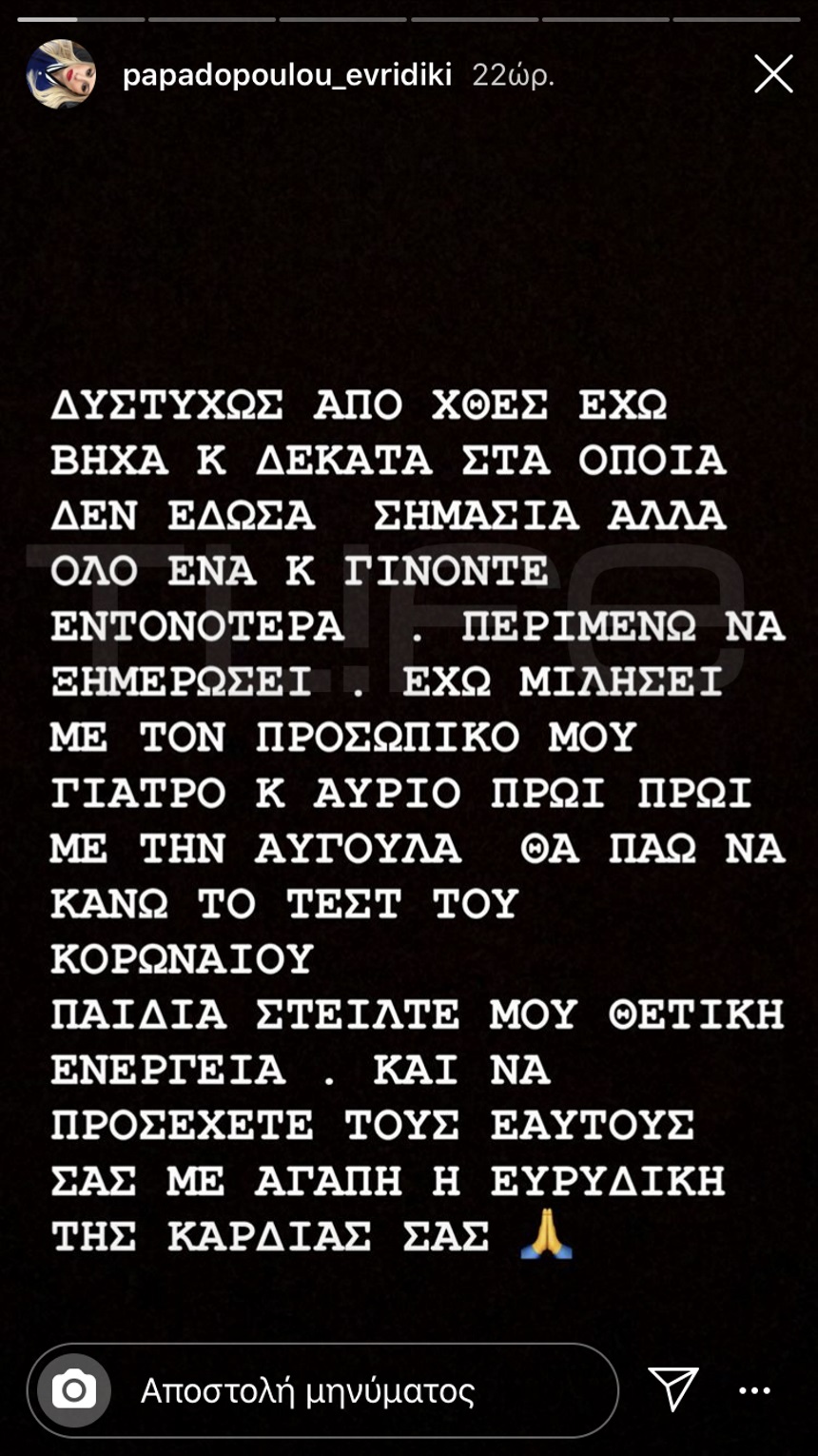 Ο λόγος; Η Ευρυδίκη, μέσα από ένα μακροσκελές κείμενο, αποκάλυψε ότι έχει κάποια ύποπτα συμπτώματα, τα οποία την κινητοποίησαν για το ενδεχόμενο να νοσεί με κορωνοϊό.