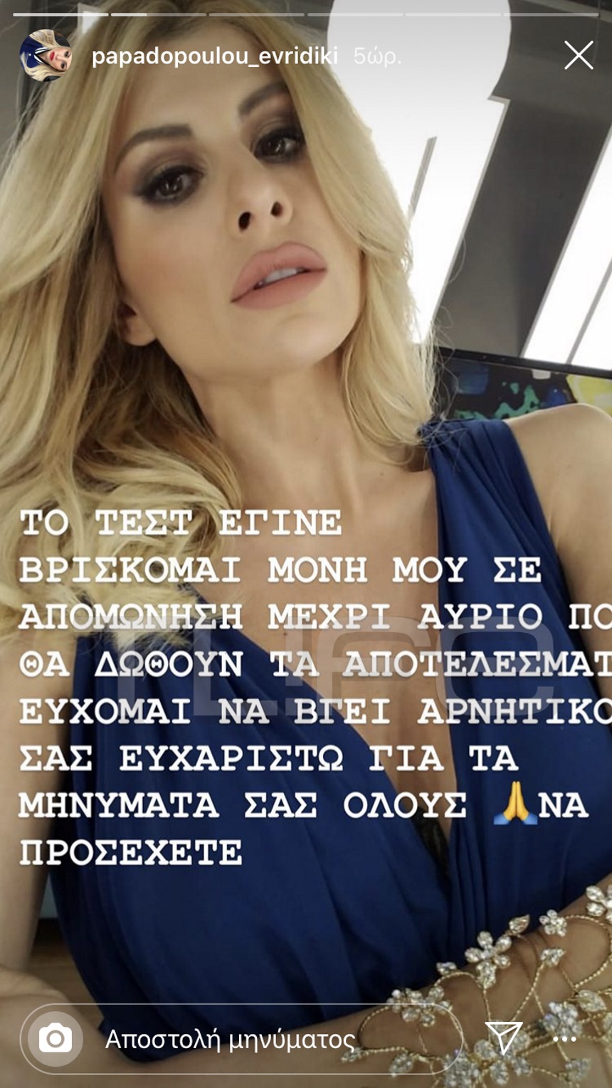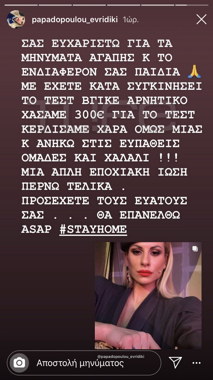 Το απόγευμα, μάλιστα, επανήλθε με νέα ανάρτηση στα instastories της, αποκαλύπτοντας πώς το τεστ έγινε με επιτυχία, αλλά η ίδια θα παραμείνει για ένα βράδυ στην απομόνωση. Συγκεκριμένα, ανέφερε: «Το τεστ έγινε. Βρίσκομαι μόνη μου σε απομόνωση μέχρι αύριο που θα δοθούν τα αποτελέσματα. Εύχομαι να βγει αρνητικό. Σας ευχαριστώ για τα μηνύματά σας όλους. Να προσέχετε!» .