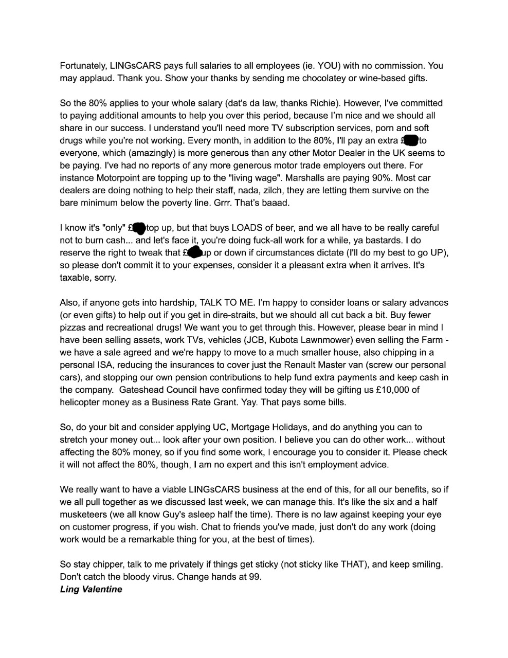 Ο Ling Valentine έχει γίνει το πρόσωπο των ημερών στο Νιούκαστλ χάρη στην επιστολή που έλαβαν από αυτόν οι εργαζόμενοι τις εταιρίας πωλήσεων αυτοκινήτων που διατηρεί με την επωνυμία LINGsCARS.
