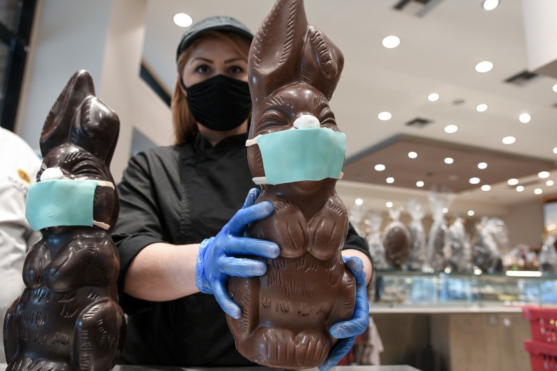 Το ζαχαροπλαστείο αποφάσισε να «ντύσει» τα κλασσικά σοκολατένια λαγουδάκια… με κάτι διαφορετικό. Φέτος, τα λαγουδάκια δεν κρατούν αυγά και δεν φορούν λουλούδια. Στους καιρούς του κορωνοϊού, το ζαχαροπλαστείο έντυσε τα λαγουδάκια με μάσκες και τους φόρεσε γάντια.