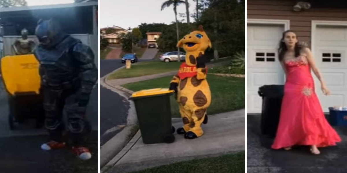 Είτε φορώντας βραδινό φόρεμα είτε στολή του Σούπερμαν, η λογική του παιχνιδιού συνίσταται στο να χρησιμοποιείς τα λίγα μέτρα ίσαμε τον κάδο απορριμμάτων σαν να ήταν πασαρέλα και μετά να αναρτάς τις φωτογραφίες σου στα μέσα κοινωνικής δικτύωσης και να μοιράζεσαι τη διασκέδαση με τους άλλους συμπάσχοντες.