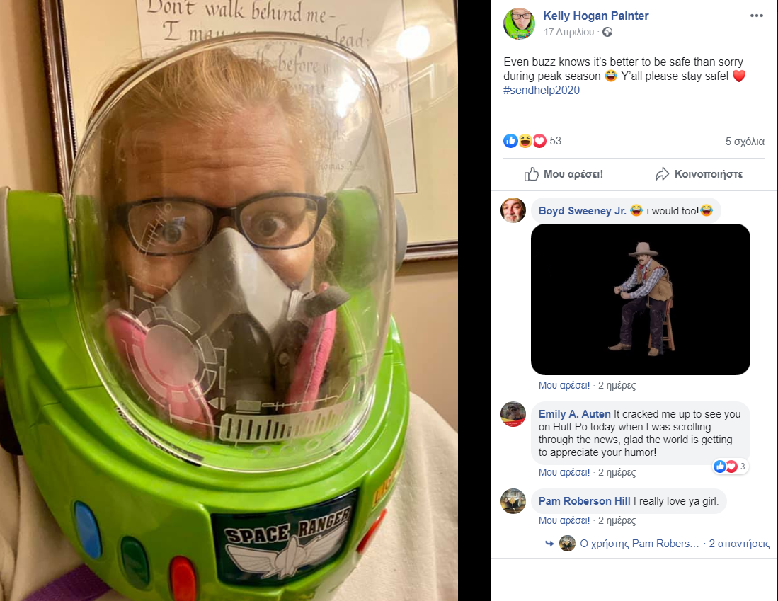 Η Kelly Hogan Painter αποφάσισε να φορέσει το κράνος από τον Buzz Lightyear, τον πρωταγωνιστή του Toy Story, μιας και δεν είχε τον απαραίτητο εξοπλισμό, για να προστατευτεί από την Covid-19.
