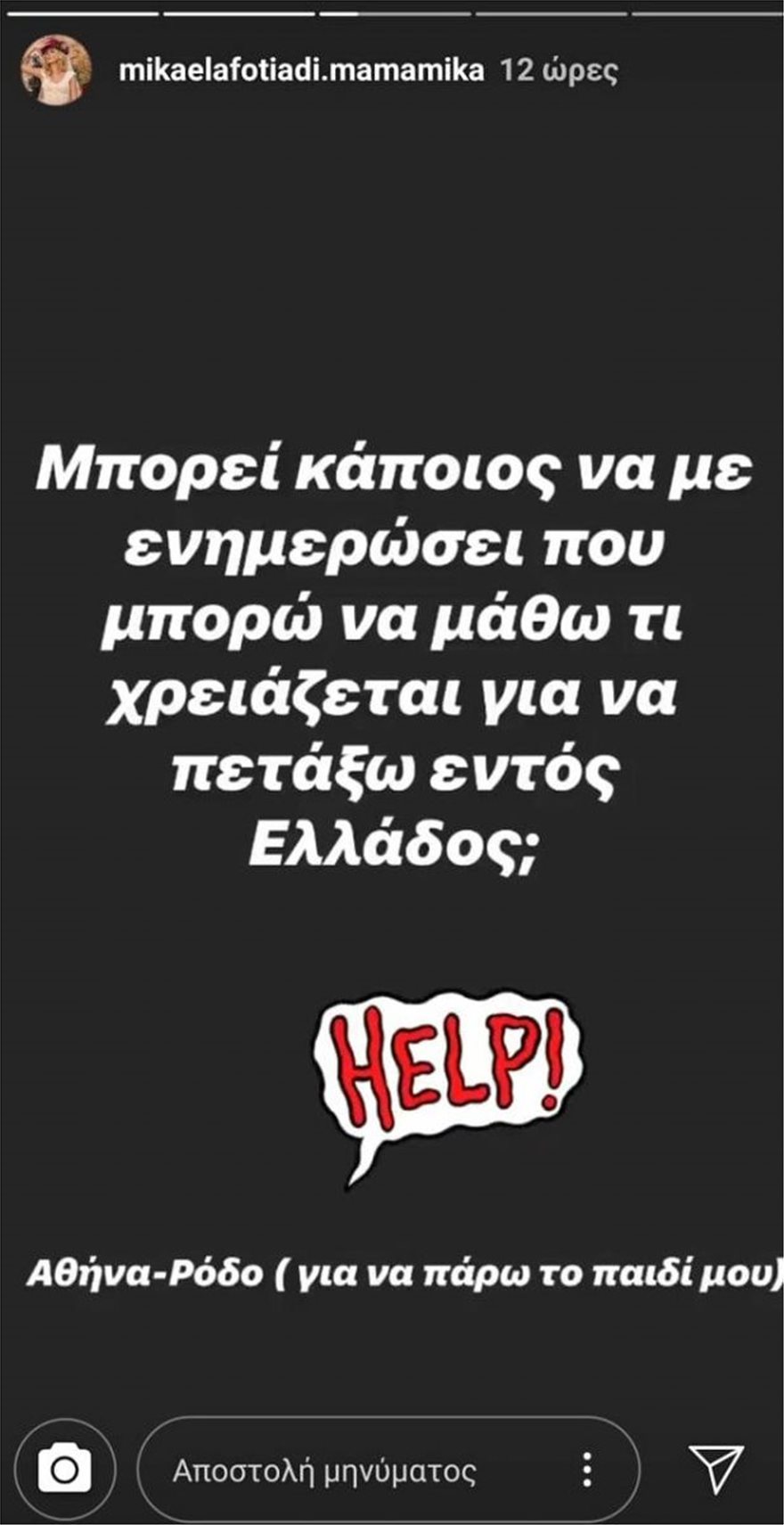 «Μπορεί κάποιος να με ενημερώσει που μπορώ να μάθω τι χρειάζεται για να πετάξω εντός Ελλάδας; Αθήνα-Ρόδο (για να πάρω το παιδί μου)», έγραψε χαρακτηριστικά στο Instastory της.