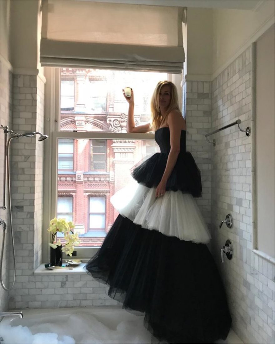 H Τζούλια Ρόμπερτς, ωστόσο, δεν έχασε την ευκαιρία να απολαύσει με τον δικό της τρόπο τη βραδιά. Έτσι φόρεσε την τουαλέτα που είχε παραγγείλει για το event και πόζαρε στο μπάνιο του σπιτιού της.