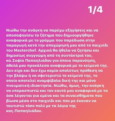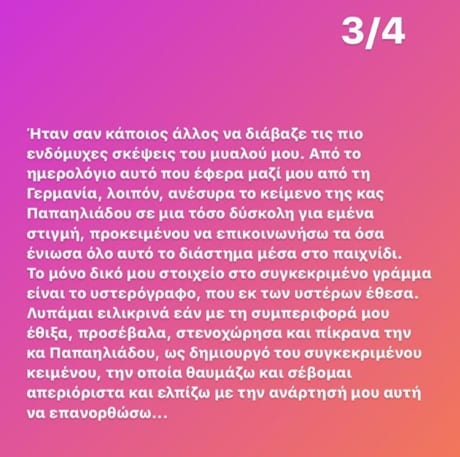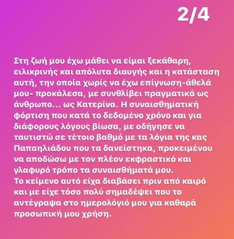 “Στη ζωή μου έχω μάθει να είμαι ξεκάθαρη, ειλικρινής και απολύτως διαυγής και η κατάσταση αυτή, την οποία χωρίς να έχω επίγνωση -άθελά μου- προκάλεσα, με συνθλίβει πραγματικά ως άνθρωπο… ως Κατερίνα. Η συναισθηματική φόρτιση που κατά τον δεδομένο χρόνο και για διάφορους λόγους βίωσα, με οδήγησε να ταυτιστώ σε τέτοιο βαθμό με τα λόγια της κας Παπαηλιάδου που τα δανείστηκα, προκειμένου να αποδώσω με τον πλέον εκφραστικό και γλαφυρό τρόπο τα συναισθήματά μου… Λυπάμαι ειλικρινά εάν με την συμπεριφορά μου έθιξα, προσέβαλα, στενοχώρησα και πίκρανα την κα Παπαηλιάδου, ως δημιουργό του συγκεκριμένου κειμένου…”.