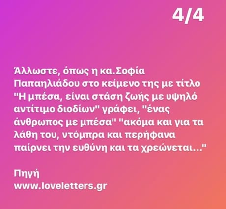 Το επίμαχο κείμενο είχε γράψει η Σοφία Παπαηλιάδου στις 20 Μαρτίου 2018 με τίτλο: “Η μπέσα είναι στάση ζωής με υψηλό αντίτιμο διοδίων”.