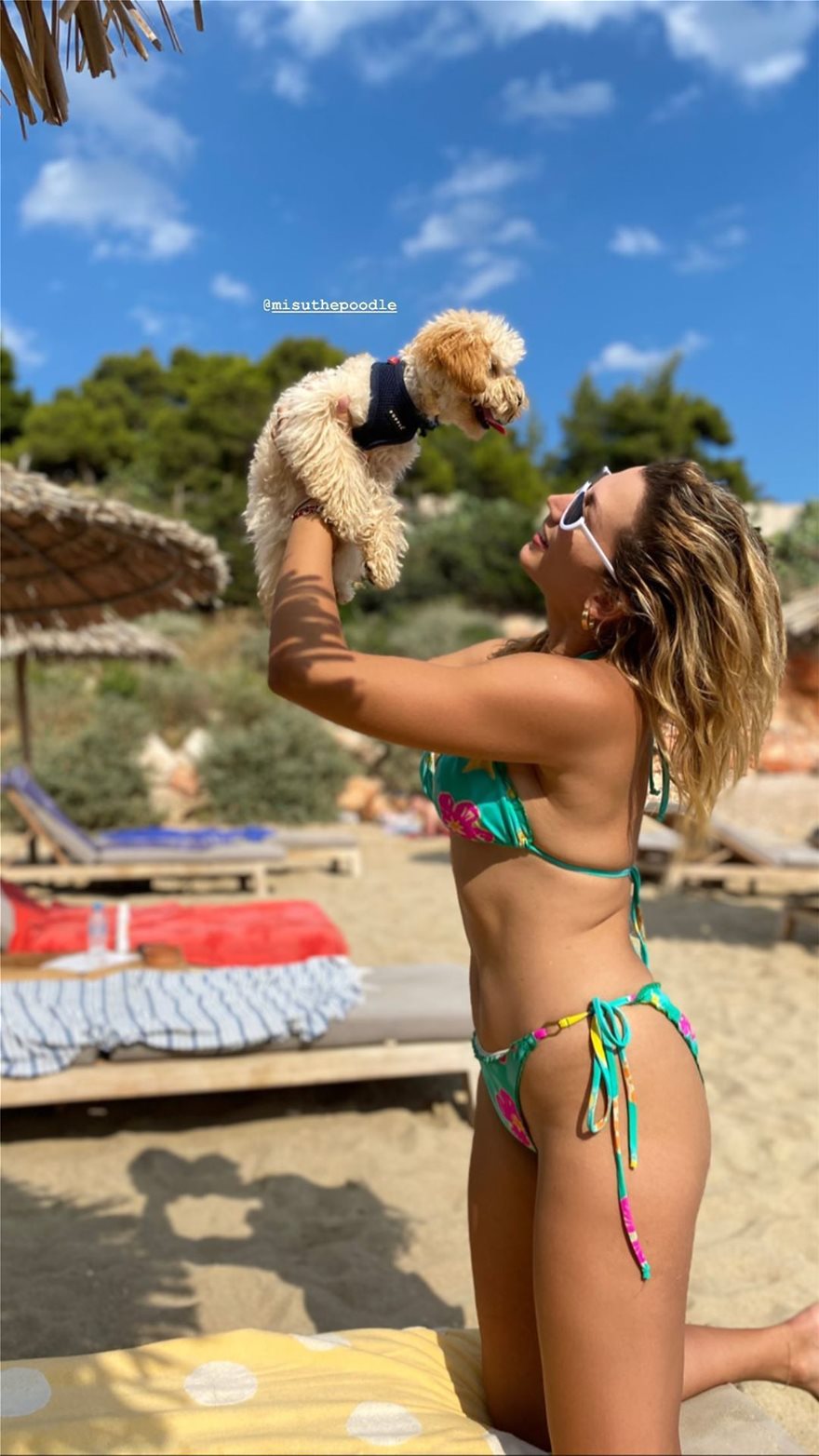 Η Κωνσταντίνα Σπυροπούλου δημοσίευσε στιγμιότυπα από τη Βουλιαγμένη, όπου αγκαλιά με τον σκύλο της Μιζού ποζάρει με floral μπικίνι.