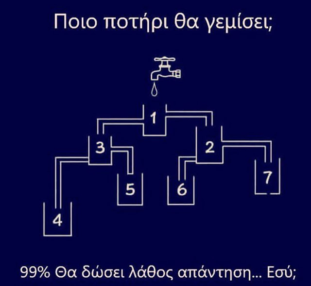 Ο γρίφος απεικονίζει μια βρύση και επτά ποτήρια και το ερώτημα είναι ποιο ποτήρι θα γεμίσει ολόκληρο με νερό. Υπάρχει μια παγίδα στην οποία πέφτουν οι περισσότεροι. Εσείς μπορείτε να βρείτε την απάντηση;