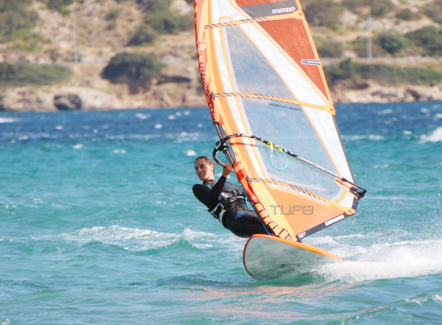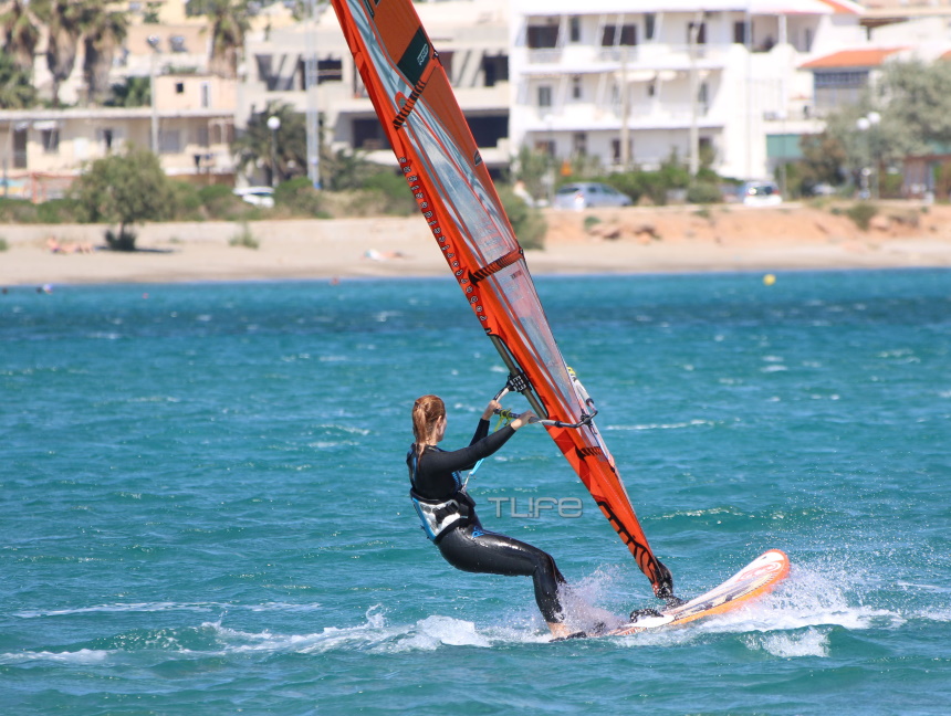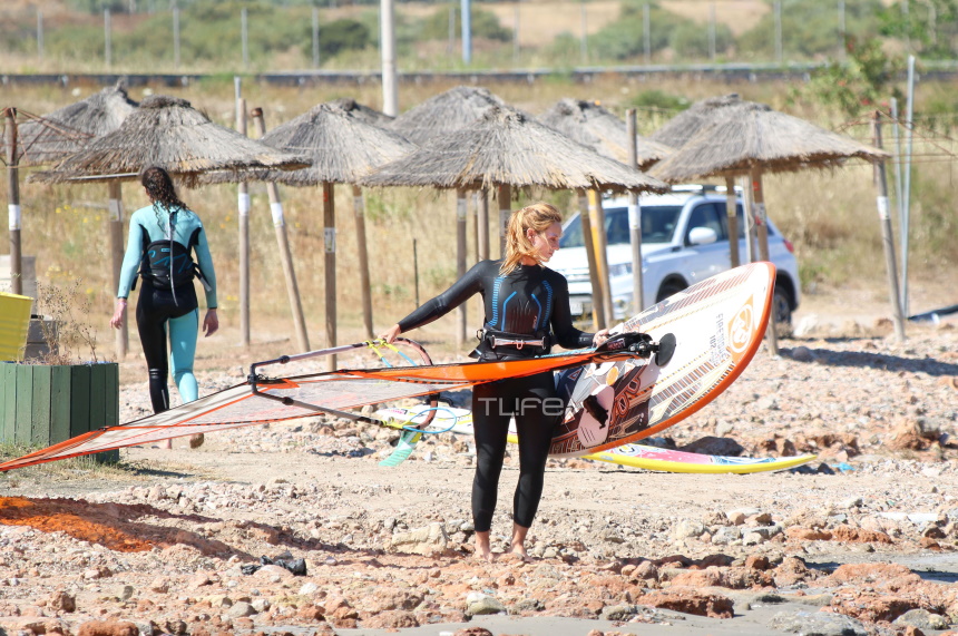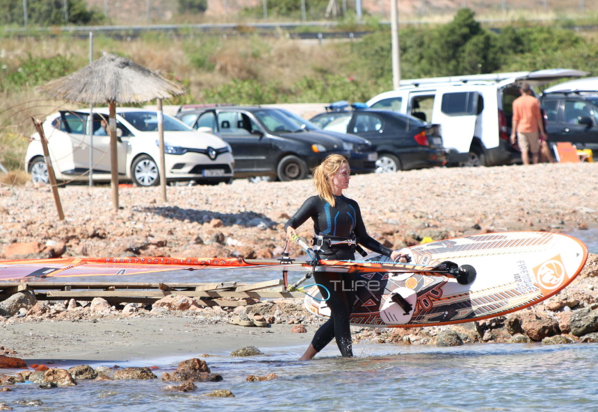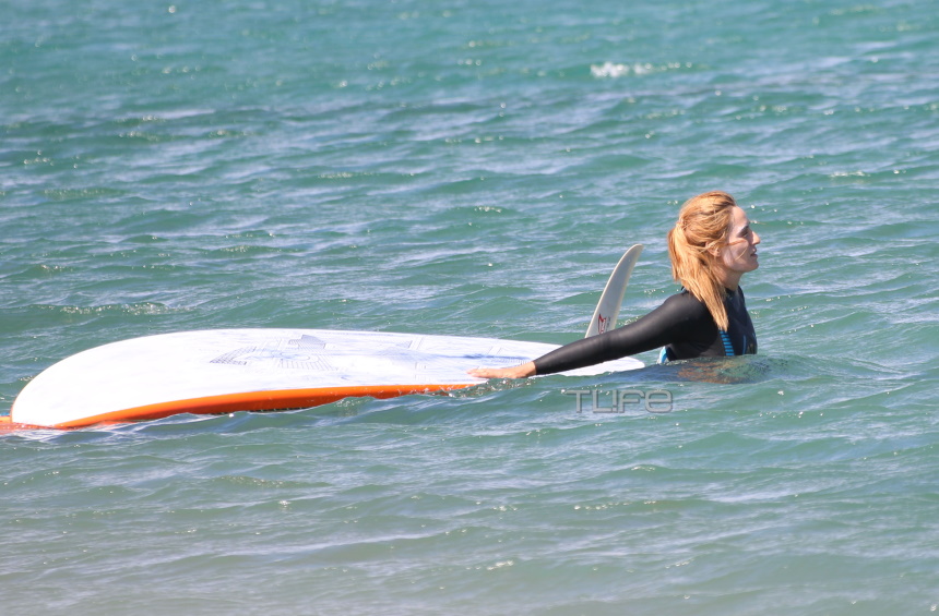 Ο καιρός ήταν σύμμαχός της, με αποτέλεσμα να είναι αρκετά ευδιάθετη κατά την άφιξή της στην παραλία, λίγο πριν ανέβει στη σανίδα της και φορώντας τον απαραίτητο εξοπλισμό για να δαμάσει τα κύματα.